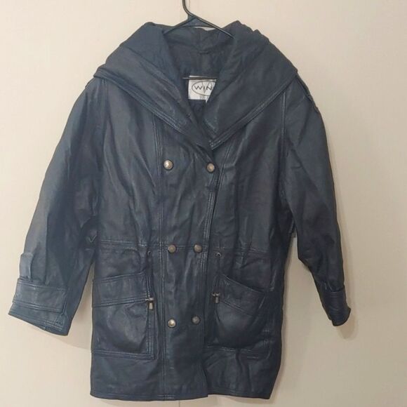 VTG Winlit Black Leather Jacket Unisex Hooded Trench Coat Size M