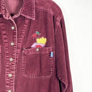 VTG Winnie the Pooh Medium Top Button Up Blouse Corduroy Embroidered Maroon 1394