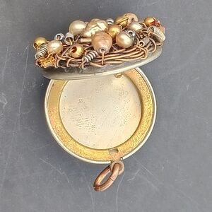 Unique vintage locket has wirework in gold and bronze tones with perlescent and metal coil pieces.