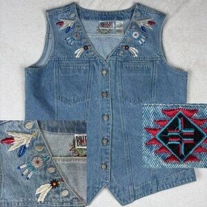 VTG Women L Embroidered Native Denim Vest Sleeveless 80s Western Boho Hippie USA