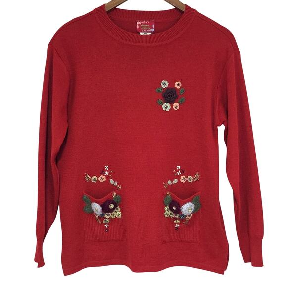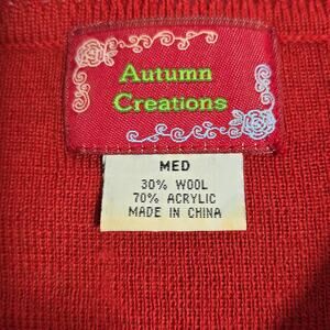 Vintage Autumn Creations Sz M Red Sweater with Floral Beaded Embroidered Wool Blend
