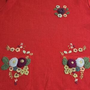 VTG Women Sz M Red Sweater 80s 90s Floral Beads Embroidered Wool Blend Crew Neck