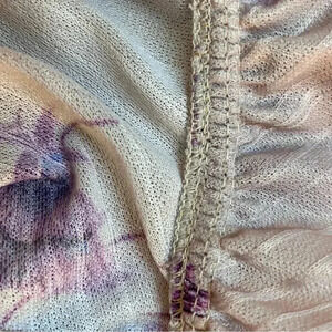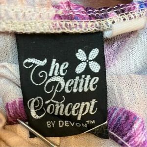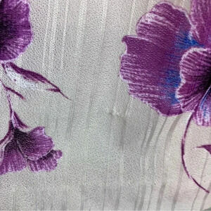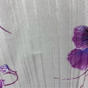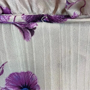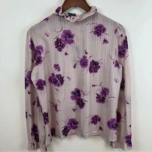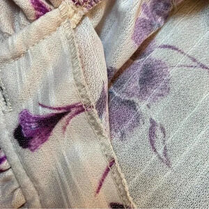 Vintage 80s blouse. Puff sleeves and ruffle neck. Tie at neck. Flutter cuffs. Sheer with purple flowers. Slight discoloration at neck. Some some pulls in the fabric.