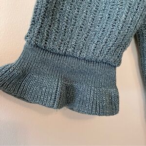 Dusty-blue metallic 3/4 sleeve sweater. Puff sleeve with ruffle cuff. Ruffle and tie at collar.