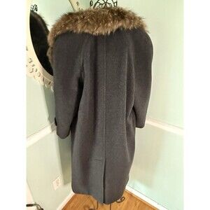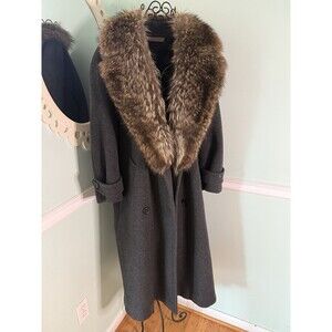 VTG Women's Perry Ellis Gray Wool Raccoon Collar Coat sz 8 Long Button Front