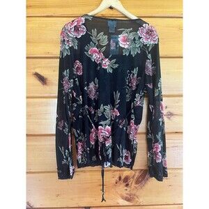 VTG Womens Sequin Stretchy Floral Shirt 18/20 Black Y2K V-Neck Roses