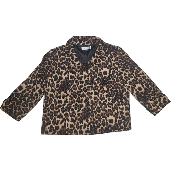 Pre-owned Tahari Arthur S. Levine women's size 18 leopard print blazer. The blazer is made of a polyester and spandex blend with a polyester lining. It features a notched collar, three-quarter sleeves, and snap button front closure. The item shows no significant wear or damage.