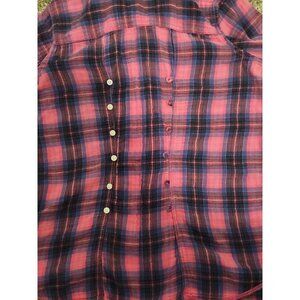 Unique Y2K button up plaid shirt. Buttons in the front and the back. Thick gauze type fabric creates intentional wrinkles. Roll tab sleeves