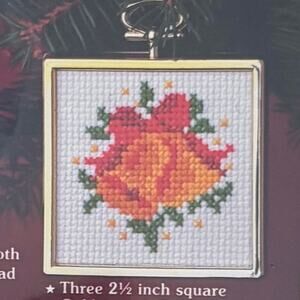 Set of three designs. Contains 100% cotton 14-count Aida cloth; 100% cotton embroidery thread; one tapestry needle; easy to follow instructions; Three 2.5" square gold-toned plastic frames with backs.
