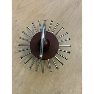 The VTG Wood Tie Rack Round Hanger Spindle Closet Organizer is a vintage/retro style tie/belt organizer made of wood in a solid brown color. This one-piece organizer has a compact size with a 7-inch length and 8-inch width, perfect for organizing ties or belts in your closet. It is easy to clean with a damp cloth and does not require any assembly. Made in the United States, this original piece adds a touch of classic style to your home organization setup.