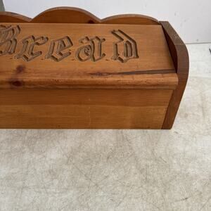 This is a vintage wooden bread box with carved details, measuring 17 inches in length, 7 inches in width, and 7 inches in height. It provides a stylish and practical storage solution for keeping bread and other baked goods fresh and organized in the kitchen.