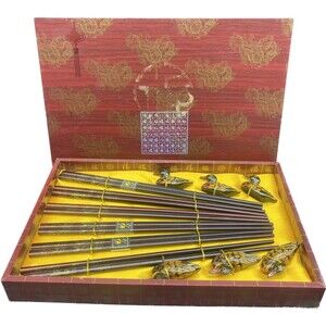 This set is brand new in the original box. The set includes six sets of chopsticks and six chopstick holders. Please see photos for an accurate depiction of condition.