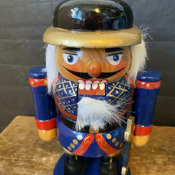 This vintage nutcracker soldier is a must-have holiday collectible. The royal palace guard is depicted in a classic blue and red uniform, complete with a wooden hat. The intricate design of the hat and the attention to detail in the soldier's outfit make this piece a true work of art.