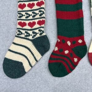 Vintage Wool Knit Christmas Stockings – Set of 4 – Classic Green, Red, and White Colorway, Traditional Fair Isle Pattern, Christmas Tree, Hearts and Snowflakes Designs, Thick Wool Knit Construction, Cozy Cabin-Inspired Aesthetic, Ribbed Cuffs for Easy Hanging, Soft and Durable Texture, Generously Sized for Gifts and Treats, Charming Handcrafted Look, Perfect for Rustic Holiday Décor, Cabin-Style Homes, Mantle Displays, or Collectible Vintage Christmas Styling.