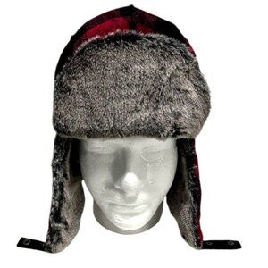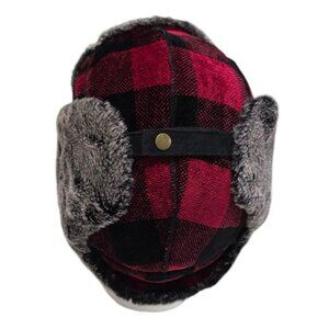 VTG Woolrich Trapper Hat Buffalo Plaid Ear Flaps Faux Fur-Lined Cap Red Black