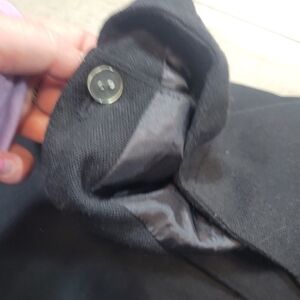 Black fully lined women's fall wrap skirt with embroidered stripes along bottom with fringe trim. Vintage 90s. Hook clasp is missing the thread to hook onto but it also has d-ring closure as well.