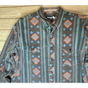 VTG Wrangler Brushpopper Shirt Mens 17.5 X 35 Black Aztec X Long Tail Cowboy Cut XL