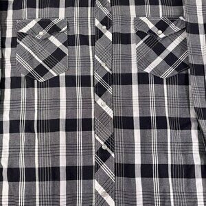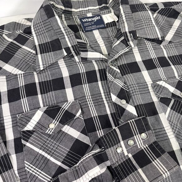 VTG Wrangler Cowboy Cut XL 19 x 35 Western Pearl Snap Shirt Black Gray Plaid