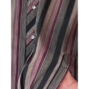 Channel that rugged cowboy grunge vibe with this vintage Wrangler western pearl snap shirt. Features bold vertical stripes in earthy tones of maroon, taupe, and black with classic chevron yoke detailing and dual flap pockets. Diagonal stripe accents on the placket and pockets elevate the retro 90s energy.