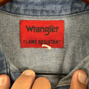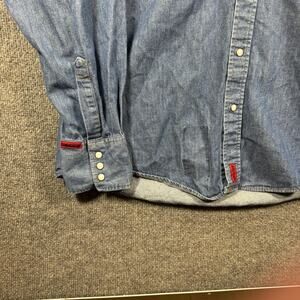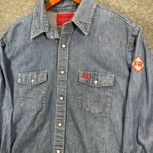 VTG Wrangler Denim FR Pearl Snap Shirt Men's Large Blue Workwear Western