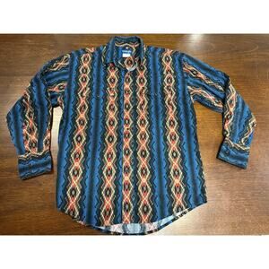 VTG Wrangler Pearl Snap Western Cowboy Shirt Long Sleeve Aztec Blue Mens Large