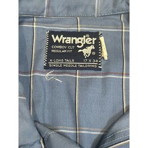 This shirt is a size 17 with a chest size of 44 inches. It features long sleeves and a regular fit. The shirt is made in the United States from a blend of polyester and cotton, and is machine washable. Add this Wrangler shirt to your collection and enjoy a piece of Western style that will last a lifetime.