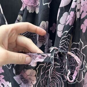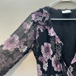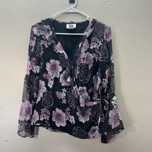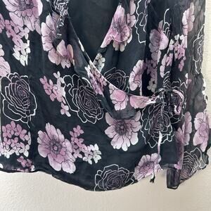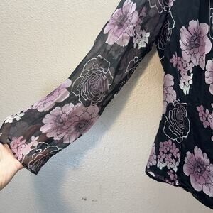 VTG Wrap Top Sz L Black Purple Floral 100% Silk Blouse Y2K 90s Whimsigoth Fairy Flowy sheer sleeves