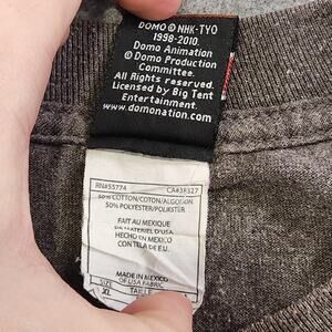 Front features large Domo character face graphic with open mouth and teeth. Unique Domo-branded neck tag. Officially licensed Domo Animation NHK-TYO, 1998-2010 with tag information and website.