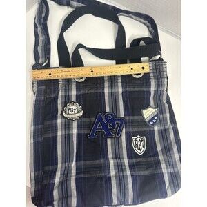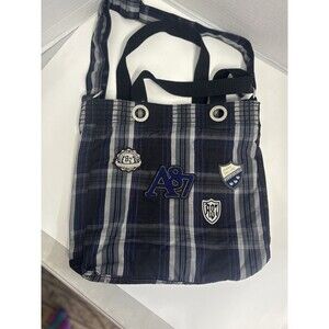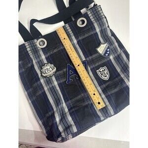 The VTG Y2K 90s Aeropostale handbag bookbag purse is a stylish and versatile accessory that combines retro charm with modern functionality. With a rectangular shape and a medium size, this handbag features adjustable handles and a crossbody strap for easy carrying options. The blue plaid design, silver hardware accents, and embroidered patches add a touch of nostalgia to the 90s-inspired theme. The lined interior and durable cotton exterior ensure both style and practicality for various occasions, from casual outings to workwear or business events. The Aéropostale brand brings a sense of authenticity to this timeless piece.