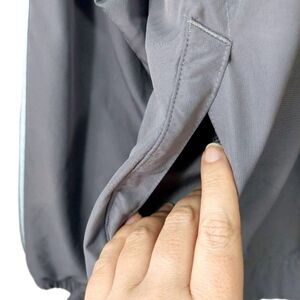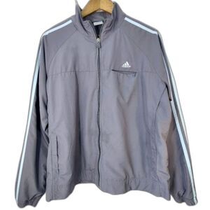 Throwback style! Embrace the Y2K trend with this authentic Adidas full-zip track jacket, perfect for the oversized vintage look. Gray jacket with classic baby blue 3-stripe design features moisture-wicking CLIMALITE technology and is ideal as a lightweight windbreaker. Great sporty activewear and athleisure streetwear for early morning jogs/running or yoga sessions! Excellent pre-owned condition with no flaws.