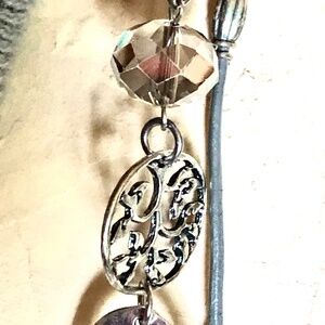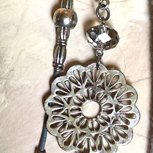 Corded necklace with filigree tree's of life, and flowers, solid round medallions, chain links, smokey colored crystal faceted glass beads, and metal beads with lobster claw clasp connector.