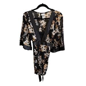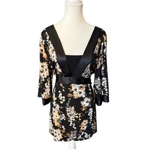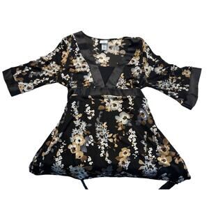 • Condition: Good preowned, no stains or rips • Size: Women’s XL; hip length fit • Measurements: Pit to pit 21”, sleeve 14.5”, length 29”, sleeve width 9.5” • Features: Satin trim, belted waist, deep V neckline, smooth soft fabric • Color: Black floral (onyx, jet black) with beige/gray blooms • Fabric: Polyester spandex blend • Style Aesthetic: Boho, Y2K 90s, retro chic, Whimsygoth, Dark Fairy, Oriental, Asian-inspired kimono, capsule wardrobe • Occasions: Work, casual, night out, dinner date, fall layering with jeans or skirts • Seasons: Fall, spring, transitional • From a smoke-free home