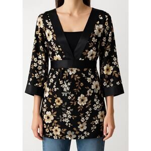 Women’s black beige floral satin trim deep V tunic top XL — chic Y2K boho vibes, whimsygoth retro 90s layering piece #fallstyle #y2kfashion #whimsygoth #darkfairy