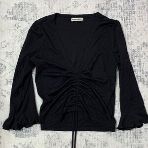 Vintage Y2K black cropped top w/ruched tie front and 3/4 sleeves w/cute flared lettuce hem