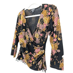 VTG Y2K Black Textured Metallic Floral Bead Trim Boho Whimisigoth Faux Wrap Top