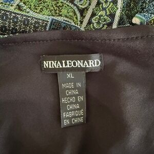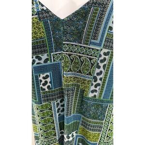 Keywords: maxi dress, patchwork print, bohemian dress, spaghetti strap dress, sleeveless maxi, casual dress, summer dress, beach dress, green dress, blue dress, nina leonard, xl dress, asymmetrical hem
