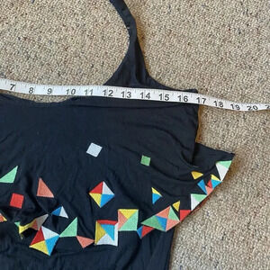 This vintage Boundary&Co women's dress is a stunning piece that will make you stand out from the crowd. Featuring a unique geometric patchwork design in a colorful palette, this sleeveless maxi dress is perfect for any occasion, whether it's a casual day out or a party. The dress is made of lightweight jersey fabric with a stretch for comfort, and it comes with pockets for added convenience.