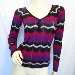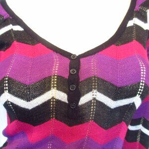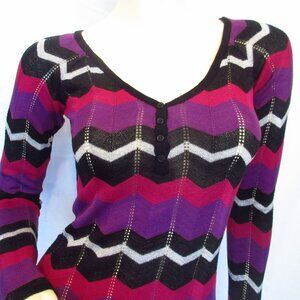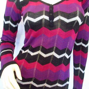 Vintage Y2K 90s 2000s Buffalo David Bitton women's long sleeve V-neck crochet knit glitter top blouse. Multicolor (purple, black, silver, glitter, red maroon) geometric zigzag Chevron striped pattern (color block). Sparkly silver glitter top. Scoop V neckline with partial button placket, henley style. Fitted long sleeve. Stretch knit. Excellent condition, preowned.