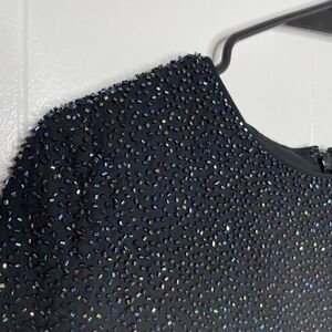 Striking vintage Y2K mini dress by Caché, made from 100% silk and adorned with intricate all-over iridescent beadwork on the bodice. The shimmering embellishments give it a dreamy, fairycore-meets-goth feel—perfect for party season, a night out, or even an edgy formal look. Fitted bodice with short sleeves and a floaty, layered chiffon-style skirt.