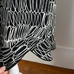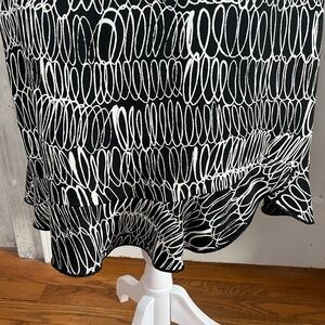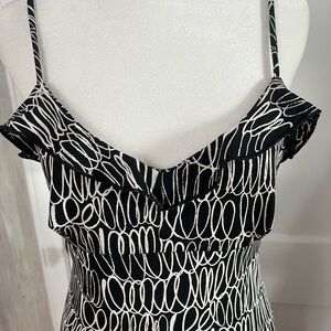 La Belle vintage y2k made in the usa Stylish dress with a unique black and white pattern. babydoll silhouette with small ruffle along V neckline, thin straps, midi length slight asymetical hem with ruffle. Dress up or down