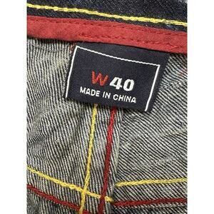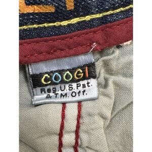 The product is a pair of vintage Y2K Coogi shorts in size 40, featuring a peacock feather design in blue denim. These baggy skater shorts are made of cotton with a 5-pocket design and a button closure. Perfect for men looking for a unique and stylish addition to their wardrobe, these Bermuda style shorts are sure to make a statement.