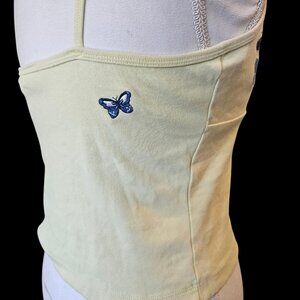 VTG Y2K Energie Light Yellow Babydoll Tank Blue Embroidered Butterfly Cropped
