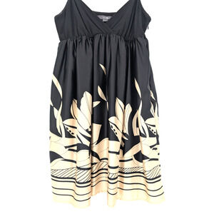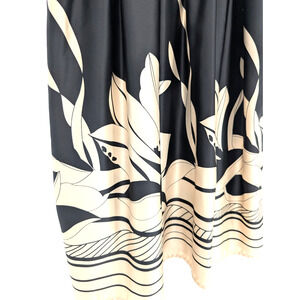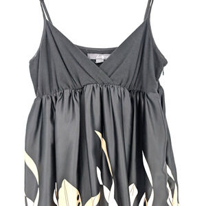 Black soft knit babydoll strappy top with high waisted satin floral printed pleated flowy skirt. Side zip. Elasticized band at empire waist.