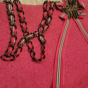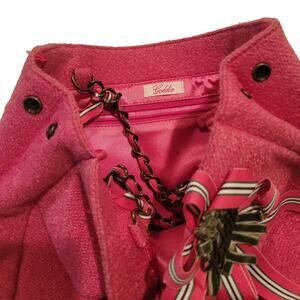 This limited edition Goldie purse echoes Barbie aesthetic in the Y2K era. Vibrant pink wool blend with ribbon detail. Ribbon is striped in pink, green, white & brown. Double chain straps are also intertwined with ribbon. Large ribbon bow on front, accented with green velvety ribbon & Goldie emblem pinned to center.