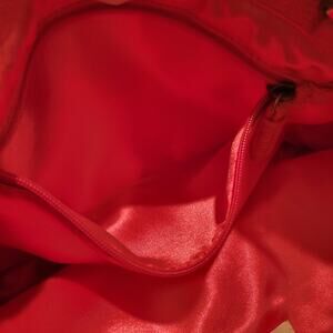 Inner lining is satin with 1 zippered pocket. Snaps on each side allow bag to expand. Open/tote style.