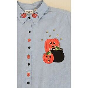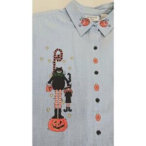VTG Y2K Halloween Embroidered Chambray Button Shirt Pumpkin Kitty Witch Sz L