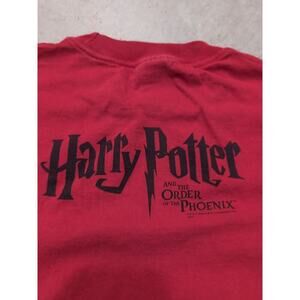 This is a vintage Y2K Harry Potter T-shirt featuring the Order of the Phoenix. The shirt is red and has a stained design. It has short sleeves and a crew neck, with a regular fit. The shirt is made for men and is a size L. The shirt has a solid pattern and a logo accent with a movie and Harry Potter theme.