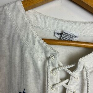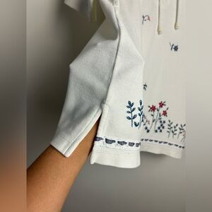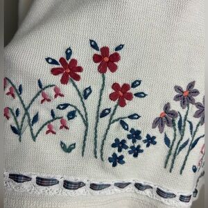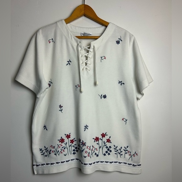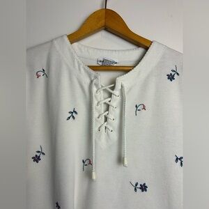 VTG Y2K Henley Tie M Waffle knit Floral Embroidered White Top Womens Grandmacore