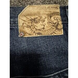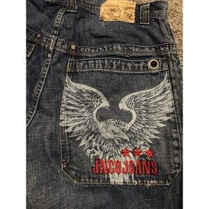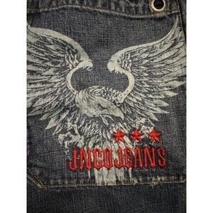 This product is a pair of *RARE* vintage JNCO jeans. Made of cotton denim with a relaxed fit, these wide-leg jeans feature an embroidered logo and eagle print on one pocket. The waist size is 34 inches and the inseam is 32 inches The brand is JNCO, known for their 90s style, brand details below from website: