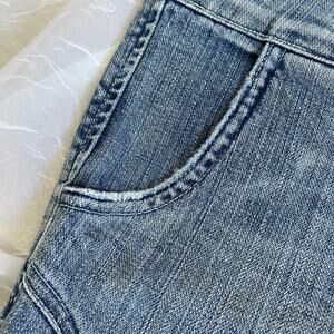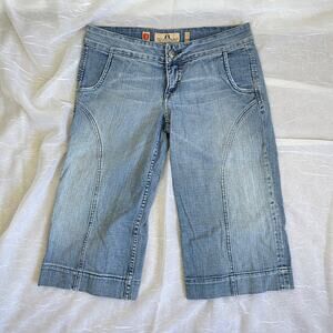 Vintage VTG Early 2000’s Y2K 00’s Juicy Couture Denim Capri Capris Gaucho Wide Leg Cropped Pants Long Shorts Jorts Casual Mom Jeans Paris Hilton Aesthetic The Simple Life Style Distressed Distressing Faded Fading Spring Summer Fall Autumn Style Fashion Back to School Preppy Girly Glam Bohemian Boho Coastal Hollywood Cool Girl Skater Grunge Aesthetic